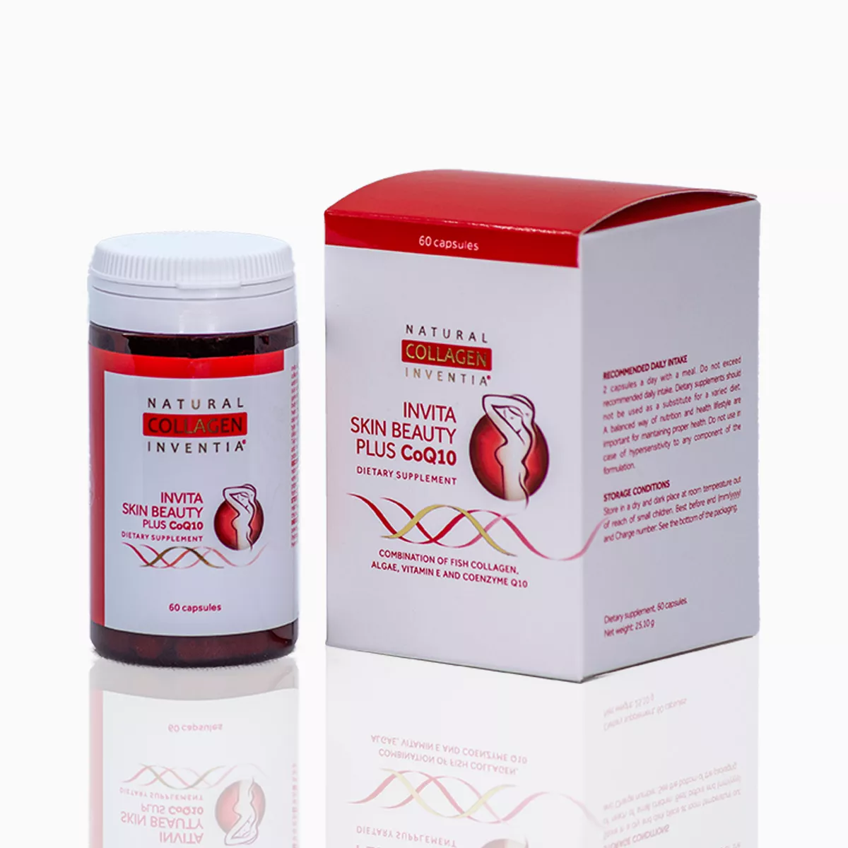 Bioaktivní doplněk stravy Invita Skin Beauty plus CoQ10 – kolagen nové generace v kapslích s jedinečným složením pro udržení krásné a pevné pokožky, pojivových tkání, pružného těla, ohebných kloubů a zdravých vlasů a nehtů. Reprezentuje zcela nový přístup v péči o pokožku a pojivové tkáně lidského těla.