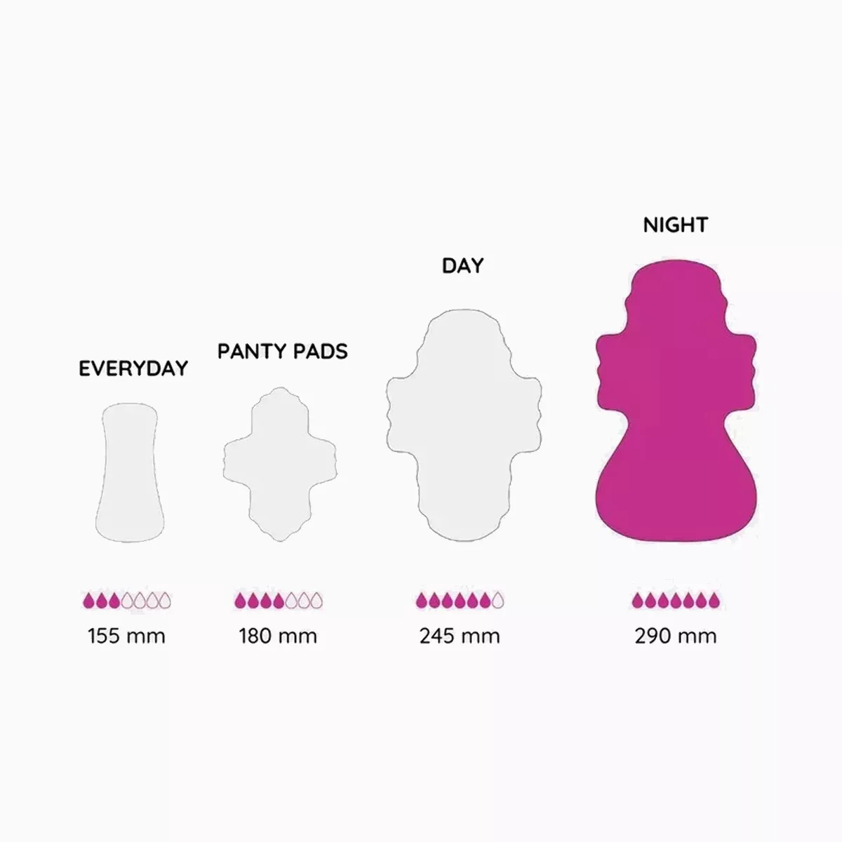 Určené na noc. Absorbují až 150 ml tekutiny. Balení obsahuje 8ks bavlněných, léčivých aniontových vložek pohlcujících pachy na noční použití.